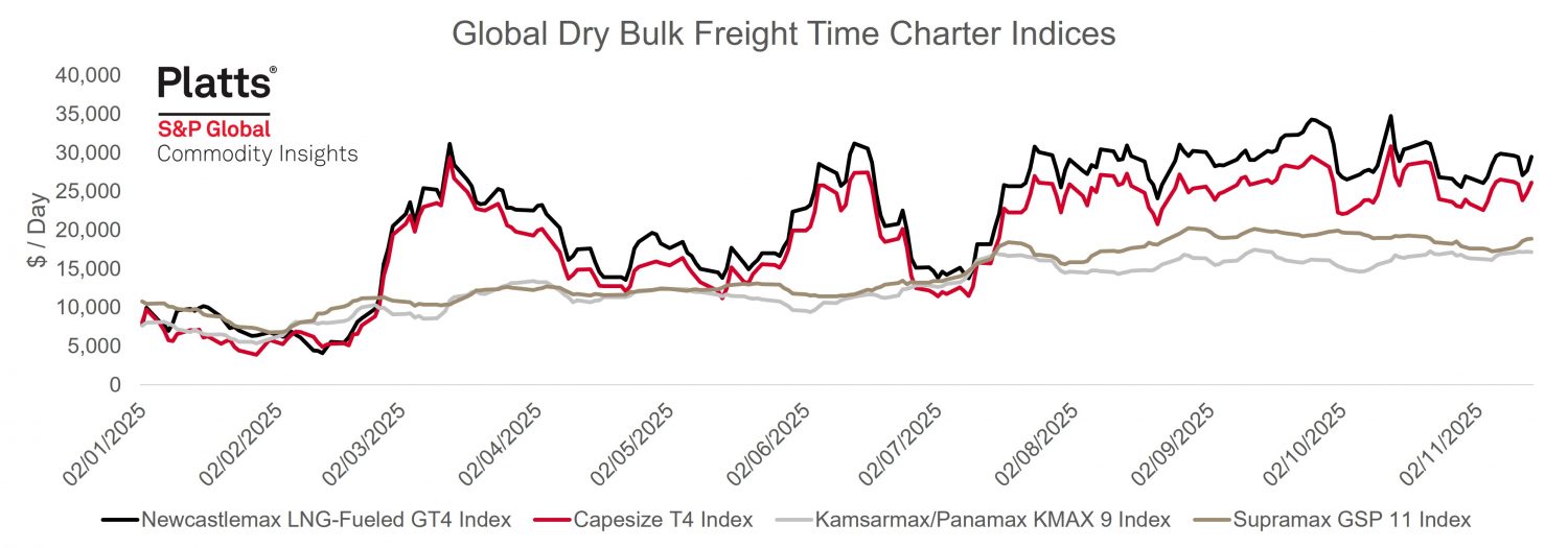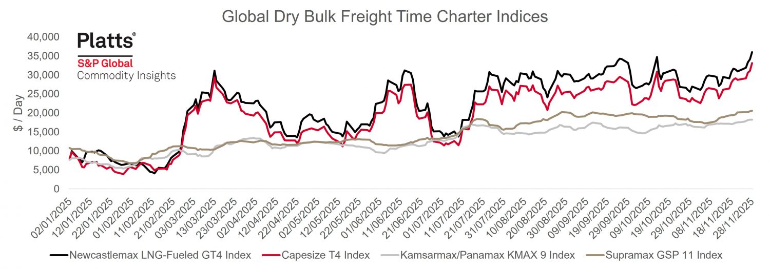 Panamax: The market held a steady tone through the week, supported by firm fundamentals in the US Gulf and US East Coast… Ultramax/Supramax: A staggered week with the Atlantic seeing a dip in activity with the Thanksgiving period at the end… Handy: The market remained broadly steady this week, with slight gains in some regions and subdued conditions in others… (Baltic Exchange: click here)